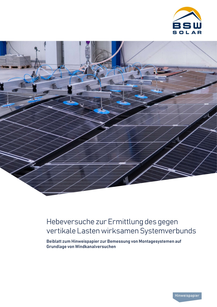 Im „Hinweispapier zur Bemessung von Montagesystemen auf Grundlage von Windkanalversuchen“, 1. Auflage, erschienen im November 2020, werden Hebeversuche zur Ermittlung des gegen vertikale Lasten wirksamen Systemverbunds beschrieben. Die in einem Modulfeld an charakteristischen Positionen ermittelte Anzahl lastenteilender Module ist ein Parameter, der in die Ermittlung von Druckbeiwerten zur Berechnung des Ballasts gegen Abheben eingeht. Als Stand der Technik hat sich in der Zwischenzeit etabliert, dass mehrere Module mit gleicher Last bis zu einer maximalen Höhe von 300 mm angehoben werden. Dieses Verfahren soll in dem vorliegenden Hinweispapier näher spezifiziert werden, sodass der bislang vorhandene Interpretationsspielraum bei der Konzeption, dem Versuchsaufbau, der Durchführung, der Auswertung und der Anwendung von Ergebnissen aus Hebeversuchen minimiert wird.